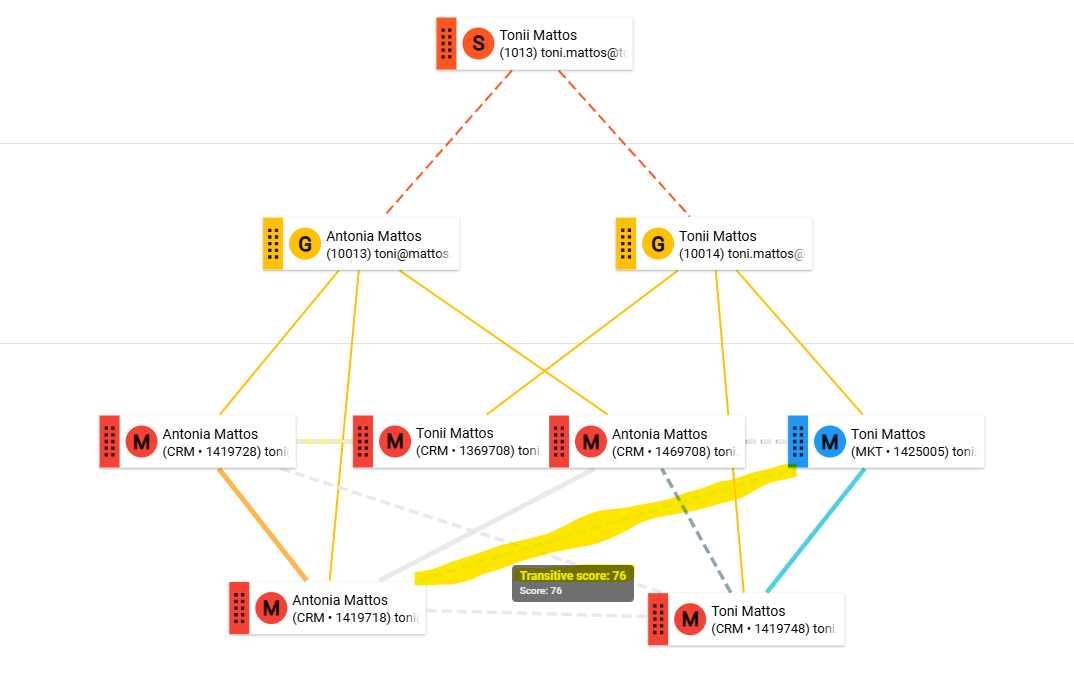 Regarding the second part of your question, I can't say for sure without seeing the use case, but I would say that those masters may have been regrouped by transitive scoring only, hence all those dotted lines.