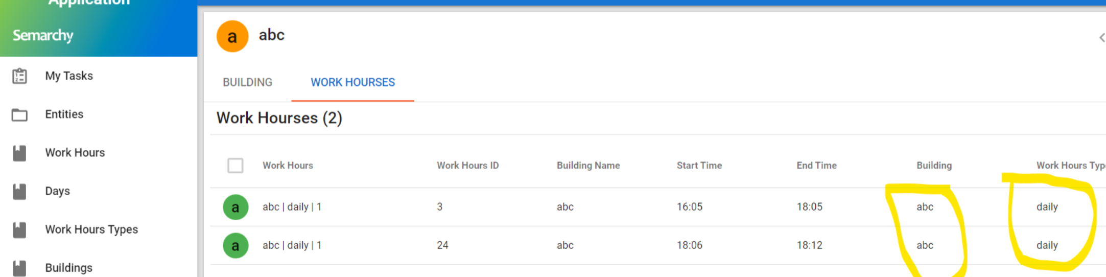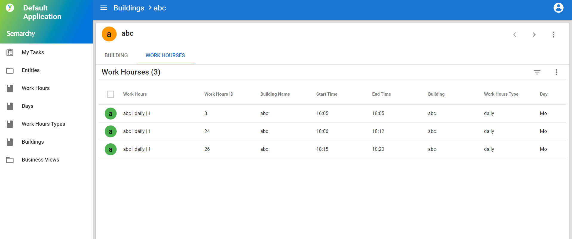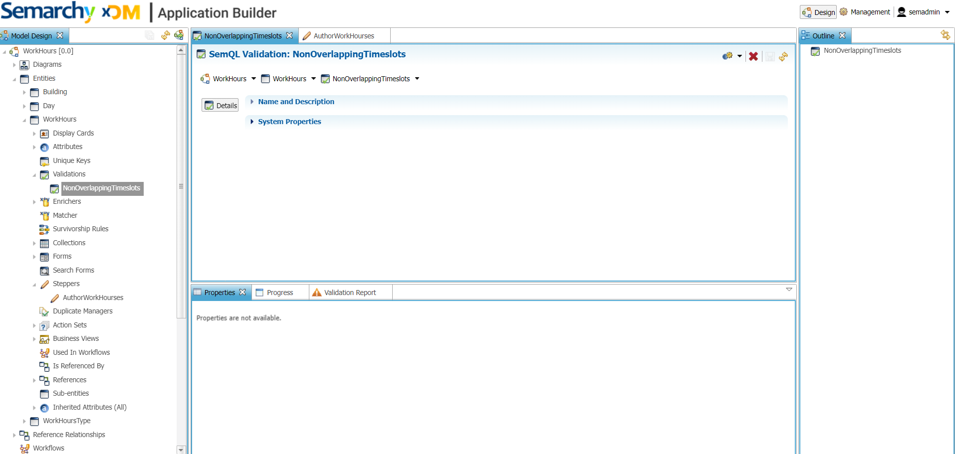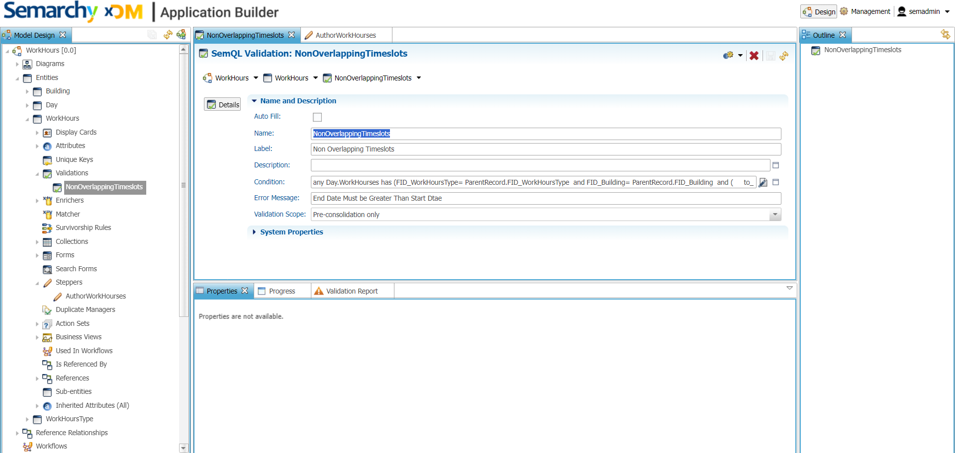 Let's take an example. Here, we have an entity Workhours and our goal is to build a validation rule that validates if timeslots with the same Workhours and Days are not overlapping.