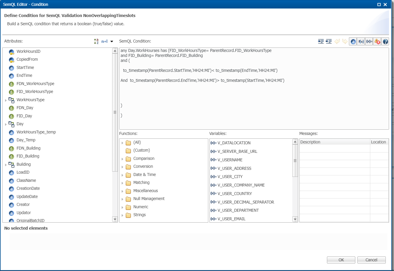 any Day.WorkHourses has (FID_WorkHoursType= ParentRecord.FID_WorkHoursType and FID_Building= ParentRecord.FID_Building and (to_timestamp(ParentRecord.StartTime,'HH24:MI')< to_timestamp(EndTime,'HH24:MI') and to_timestamp(ParentRecord.EndTime,'HH24:MI')> to_timestamp(StartTime,'HH24:MI') ) )
