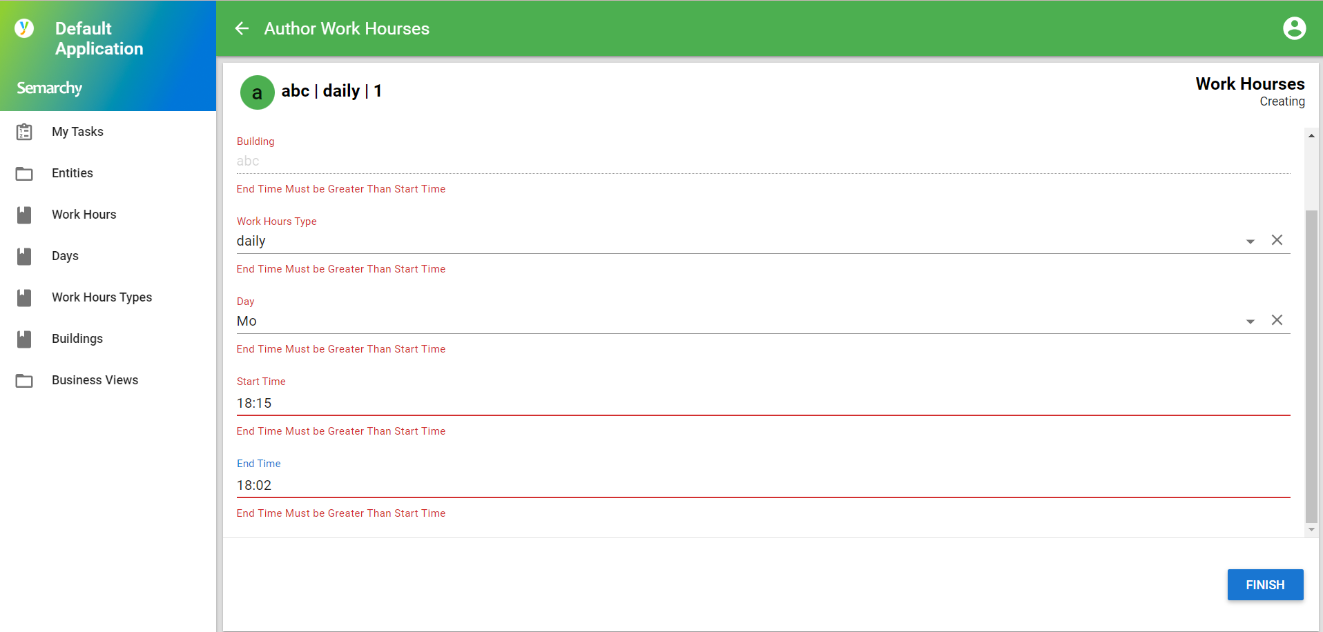 - Here we see our validation in action > end time must be greater than the start time for same work hours and same day: