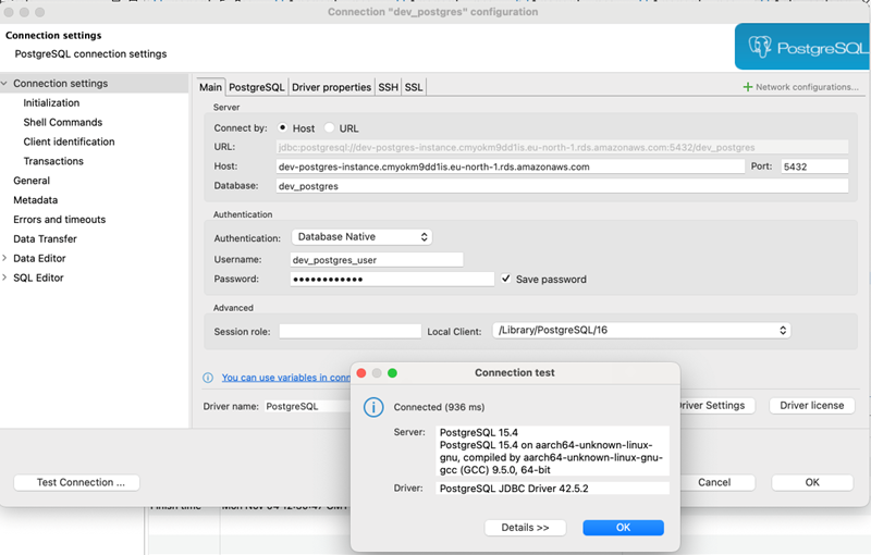 Using any DB client try to connect to DB. You should be able to successfully connect and can only see public schema. Under users ensure to see the master user you've used in the DB creation command. In our case it is dev_postgres_user.