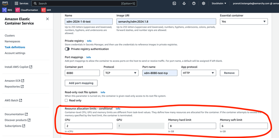 9. Go back to task definition and in container-1 section add the details as shown below.