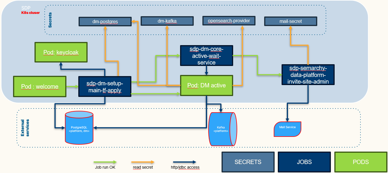 sdp-self-hosted-dm-core-active- | | Keycloak up and running PostgreSQL up and running Kafka up and running DM access to keycloak from external URL (DNS setup) dm-postgres secret, dm-kafka and opensearch-provider secret